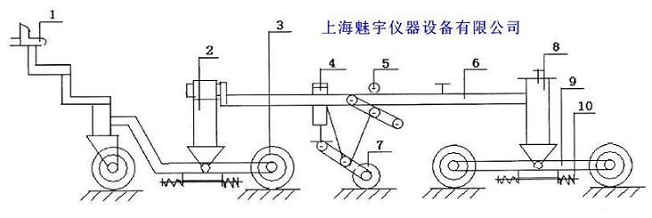 结构组成: 该仪器由机械和电器部分组成。电器部分单独装在仪器箱内,由二根电缆与机架有关部分位移 ■机械结构(见下图)  机械部分由下列部分组成: 1、牵引部分:由连接插头与拉杆组成,通过螺母与前桥相连; 2、前桥: 3、车轮:同八个充气轮胎形成的摩托车轮通过前后架构构成; 4、位移传感器:无接触电容式位移测量系统; 5、锁止机构: 6、主架:包括伸缩方管、导向结构、后架等; 7、测量轮:由加压弹簧及提升机构、橡胶轮、距离传感器组成; 8、后桥: 9、轮架: 10、减震机构。 ■电充部分 本仪器电器部分是以51系列微处理为核心外加地址锁寸器、32K数据存储器、程序存储器等电路组成; 由于单片机本身是按工业测试环境要求设计的,其抗干扰性能优于一般使用的微处理器,非常适用于像公路测量这样的野外工作。电源由胶体免维修电池提供电能,仪器所需各类电压均由电源通过DC/DC转换模块及精密稳压电路提供,这样及简化了硬件电路,又保证了电压的稳定性。输出部分,由打印机和显示装置组成。电器部分构成框图如下: