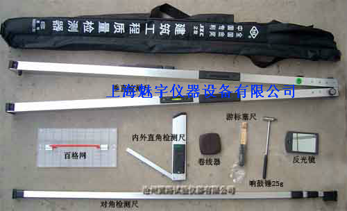 厂家价格2米靠尺,2M靠尺套件: ◆垂直检测尺:检测物体平面的垂直度,平整度及水平度的偏差。 ◆对角检测尺:检测方形物体两对角线长度对比的偏差值。 ◆内外直角检测尺:检测物体上内外(阴阳)直角的偏差,及一般平面的垂直度与水平度。 ◆楔形塞尺:检测建筑物体上缝隙的大小及物体平面的平整度。 ◆磁力线坠(8功能):检测建筑物体的垂直度及用于砌墙、安装门窗、电梯等任何物体的垂直校正,目测对比。 ◆百格网:百格网采用高透明度工业塑料制成,展开后检测面积等同于标准砖,其上均布100小格,于检测砌体砖面砂浆涂复的饱满度,即覆盖率(单位%)。 ◆检测镜:检测建筑物体的上冒头、背面、弯曲面等肉眼不易直接看到的地方,手柄处有M6螺孔,可装在伸缩杆或对角检测尺上,以便于高处检测。 ◆卷线器:塑料盒式结构,内有尼龙丝线,拉出全长15米,可检测建筑物体的平直,如砖墙砌体灰缝、踢脚线等(用其他检测工具不易检测物体的平直部位)。检测时,拉紧两端丝线,放在被测处,目测观察对比,检测完毕后,用卷线手柄顺时针旋转,将丝线收入盒内,然后锁上方扣。 ◆伸缩杆:二节伸缩式结构,伸出全长410毫米,前端有M6螺栓,可装锲形塞尺,检测镜,活动锤头等,是辅助检测工具。 ◆焊接检测尺:检测钢筋折角焊接后的质量。 ◆水电检测锤(锤头重50G):使用于检测水电管道安装、地面装饰等工程,利用敲击振动的声响,来判断物体的牢固的程度及施工质量。 ◆响鼓锤(锤头重25G):轻轻敲打抹灰后的墙面,可以判断墙面的空鼓程度及砂灰与砖、水泥冻结的粘合质量。 ◆纲针小锤(锤头重10g): ①小锤轻轻敲打玻璃、马赛克、瓷砖,可以判断空鼓程度及粘合质量。 ②拨出塑料手柄,里面是尖头钢针,钢针向被检物上戳几下,可探查出多孔板缝隙、砖缝等砂浆是否饱满。 ◆活动锤头锤头上M6螺孔,可安装在伸缩杆或对角检测尺上,便于高处检验。